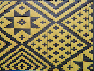 So how do I come up with a design? Well, in the case of the Cherokee Twills above, I did see a picture online of the bottom of a basket with this twill pattern and thought it was too pretty to be hidden in the bottom. It was clear enough to get a "read" on the pattern on the star in the upper left, so I started at that point and faked it from there... all widths are 1/8", done in black and harvest gold, placed on a black and white mat in a clear glass frame. Pretty striking in person!